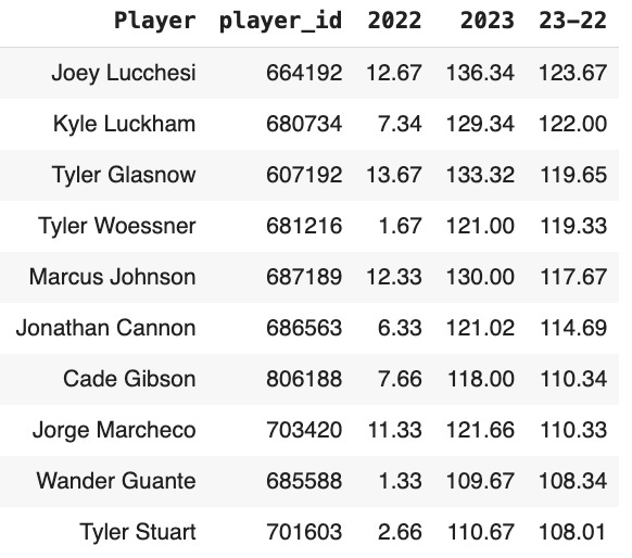 I kinda thought he was dying out in late-April there but nope, these last three starts have been his best stretch so far. It’s certainly not impossible to add triple-digits to your innings count in one season. It’s not like your arm is certain to fall off your body after you get to +90 or something. Here are some names that added 100+ innings to their innings from 2022 to 2023: