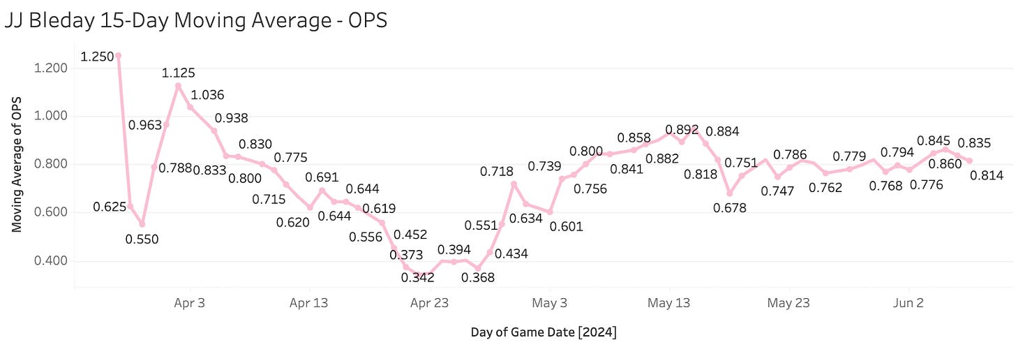 JJ Bleday has been popping up a lot this year and he continues having success. He’s been surprisingly consistent, and that is a testament to his much-improved strikeout rate (his 19% K% is down more than five points from his career average)