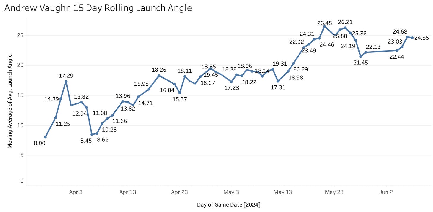 Andrew Vaughn is a very deep league target, after a pitiful first month he’s been pretty good with a .762 OPS and six homers since May began. The GB% is way down to 30% and the Brl% is nice at 11.5% to go with his normal good K% (21%).