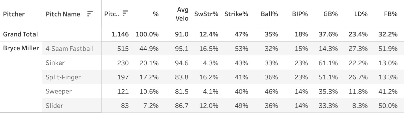 The four-seamer is still great with the 16.5% SwStr% and 53% Strike%, it’s one of the best four-seamers in the league (for SPs), and the new splitter has been pretty decent as well, but not quite enough to get him into elite pitcher territory. He’s still must-own and must-start in most matchups, but there’s still some work here to do.