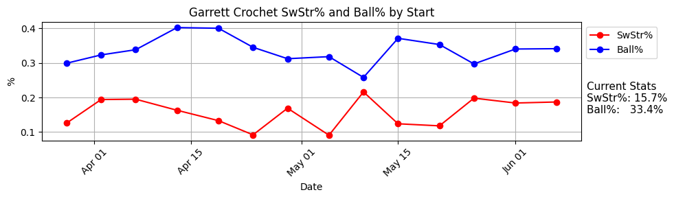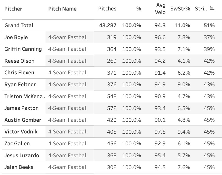 The league averages for four-seamers are a 10.7% SwStr% and 50% Strike%. That 42% Strike% is third-worst in the league (250 FF thrown minimum) to Joe Boyle and Griffin Canning.
