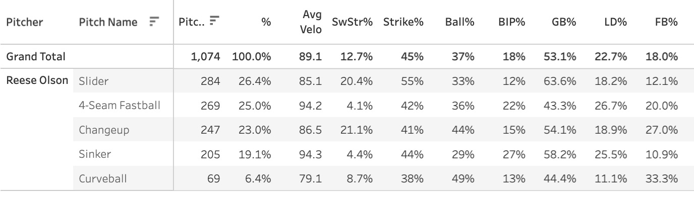 It was actually a pretty good 15.7% SwStr%. This kind of outing can happen to anybody, baseball is random, but I will not stop beating the drum that pitchers with bad fastballs are at a significant disadvantage. Olson’s four-seamer is now at a 4.1% SwStr% and 42% Strike%: