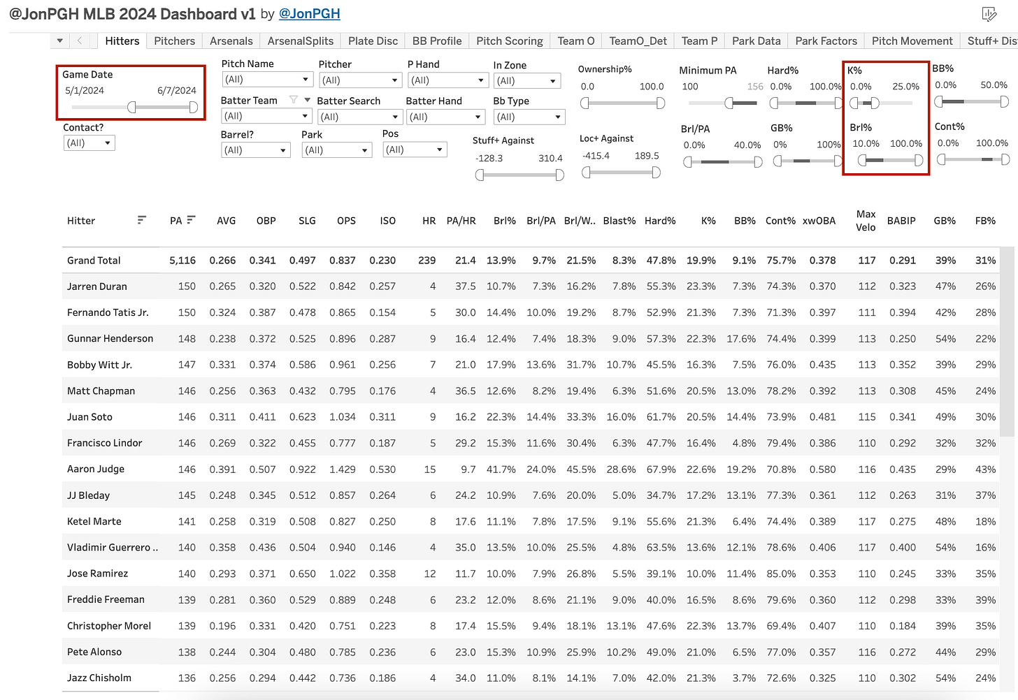 Let’s look at May-June for hitters with double-digit barrel rates and sub-25% strikeout rates. You can do this yourself at any time with the main MLB dashboard.