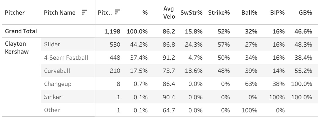 The guy is still elite with a 15.8% SwStr% and a 52% Strike% on the year. He’s still throwing that slider a ton, and the four-seamer hasn’t been all that great. For a young player, I’d say this was a red flag - we don’t really love starting pitchers overly reliant on a breaking ball without a strong fastball backing it up - but Kershaw is a different story.