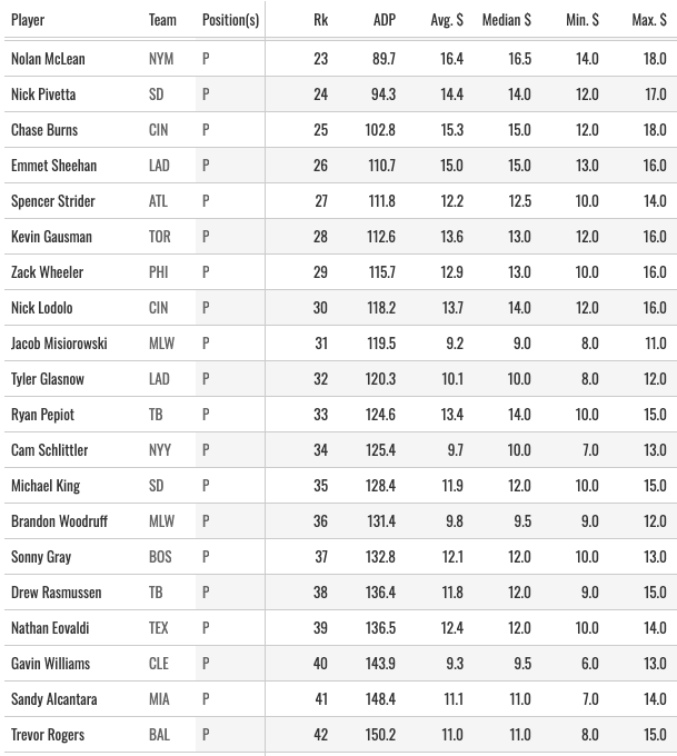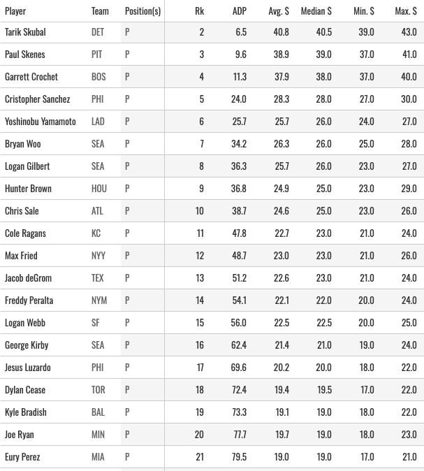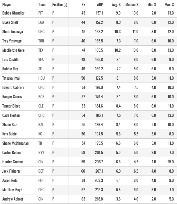 And again, there are plenty of guys in that clump of middle-round names I like. I could see myself grabbing Skubal, Gilbert, Eury, and Misiorowski early. Grabbing Trevor Rogers in the middle, and then just taking 2-3 of those “last round fliers” I like to talk about. That should get us a decent offense with a ton of SP upside.