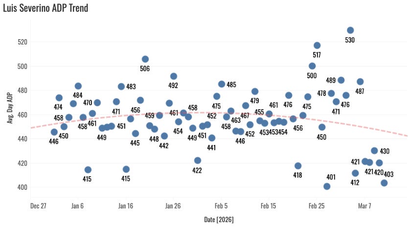 That said, his velo was up in spring action even before the WBC. So it’s reasonable to think that’s he’s healthier this year and we could expect more 97mph from the heater than 96. And the sweeper is pretty sick, as well. I’m not anywhere close to calling Severino a standard league target, but in the mid-400s of ADP it’ll play. He’s the A’s Opening Day starter, you’d think. So the volume should be there.