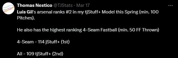 The Yankees need SP help, and Gil is banging down the door to earn a spot. He has a 41% K% this spring (44 batters faced), and his Stuff+ is grading out marvelously in the models that are able to ingest the spring data. He has a 21.1% SwStr% on 194 pitches tracked with a beautiful 52.6% Strike%, so he's looking extremely good. It’s less clear if he can make the Yankees rotation, but I would probably add him when/if it’s announced he’s in there.