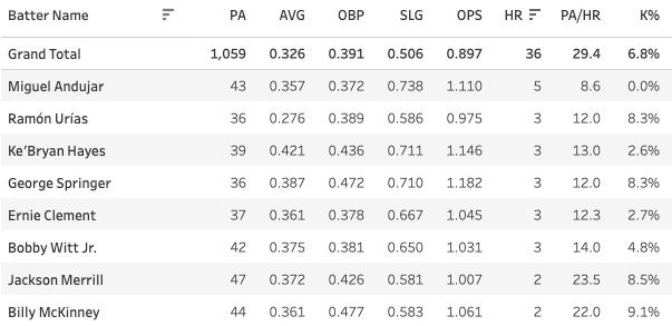 39 PA, .314/.385/.714, 4 HR, 13% K%, 7.7% BB%