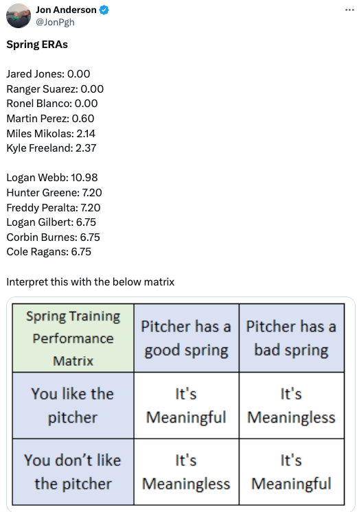 Logan Webb has just been brutalized this spring, but I’m guessing he does not give an F. The K% is 22% and the BB% is 3%, so it seems like he’s just been BABIP’d to death. This should change your view not at all.