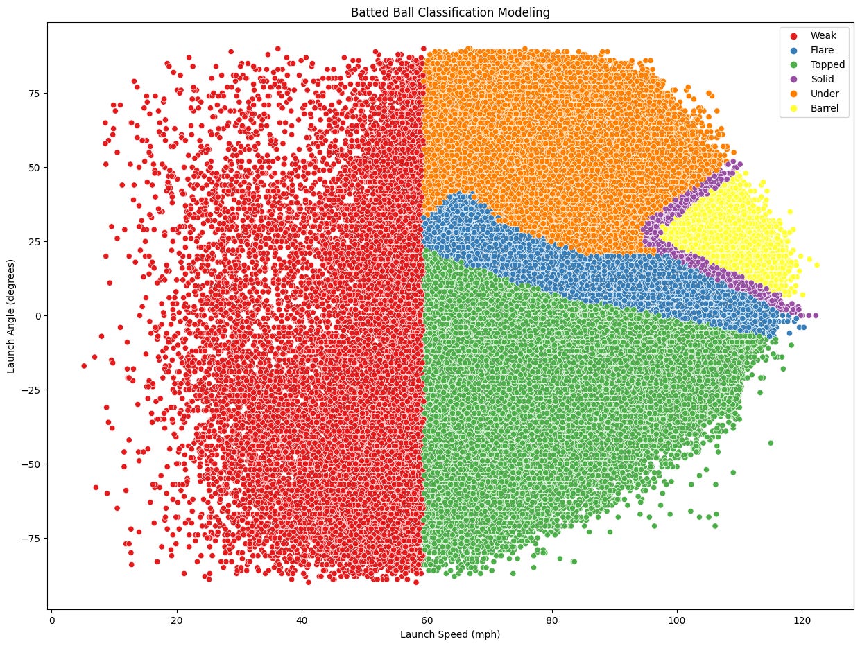 The reason my model doesn’t have an exact GB%, LD%, FB% projection for these guys because I utilize the six batted ball classification from the Statcast algorithm, here’s that plot again showing each of the six based on launch angle and velocity: