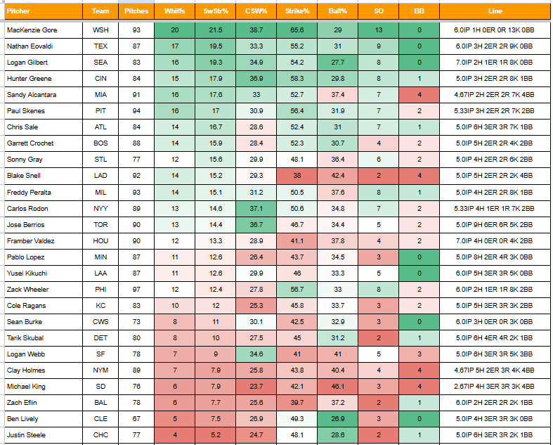 Hunter Greene and Logan Gilbert did their usual thing. Greene struck out a ton of dudes, as per usual. The command was great yesterday as well. I’m not sure if I’m going to buy into that. And these cold weather games help him a good bit as a fly ball pitcher. He was elite last year, and while I do expect some regression from those sick ratios, he’s one of the best pitchers in the league in terms of raw stuff. If he is locating his pitches with any level of success, he’ll be a guy you’re very, very happy with.