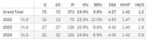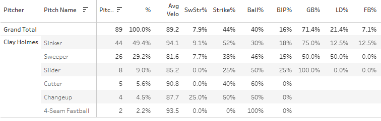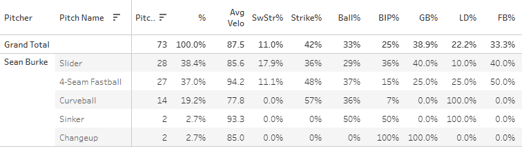 But you can see the lack of strikeouts there. The SwStr% was just 11% and his overall Strike% was awful at 42.5%.