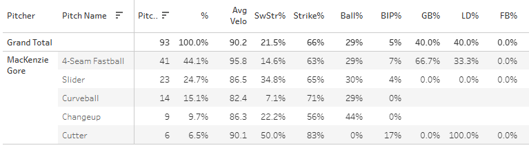You do not see many 13:0 K:BBs. There might be a handful this year, and Gore put one up immediately. Here’s the pitch mix (Arsenals tab of the main dashboard).