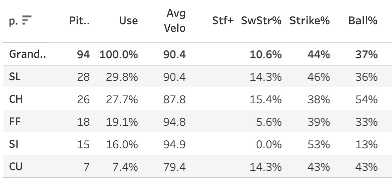 Ragans wasn’t throwing strikes (44.4% Strike%) and Burrows just didn’t do anything much well (10.6% SwStr%, 37.2% Ball%).