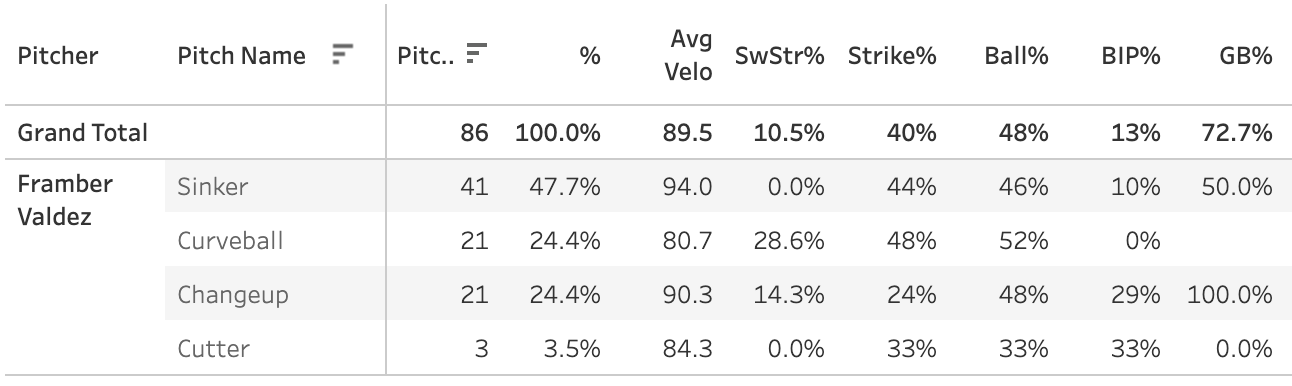 The bad pitchers were pretty much bad. Gray, Wood, Freeland, and Mikolas all struggled. Framber Valdez got off to a very bad start with six walks, but limited the damage thanks to the big ground ball rate. No reason to change your opinion on that, but yeah he needs to do a whole lot better than a 48% Ball% (you’re looking for a number below 36% in that stat).