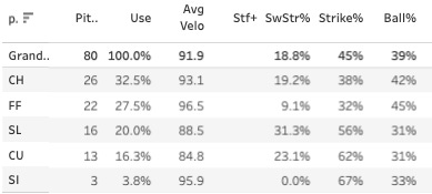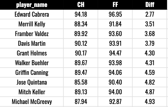 I’m not sure if we should even call that a changeup. Last year, the changeup averaged 94.2mph, the fastest changeup in the league. And that creates very little daylight between his fastball and changeup. I CHECKED! I got FF and CH velo for qualified starters from last year and this year and then took the velo difference: