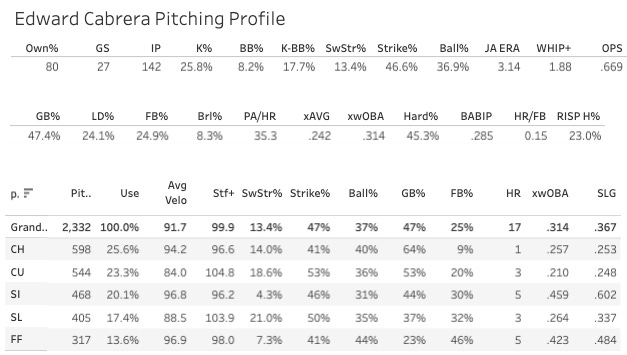 Edward Cabrera is similar to McCullers in that it was several years of the guy having no command. But he massively improved that in 2025, and he couldn’t have begun 2026 on a much more positive note. It was against the Angels, but it was an 18.8% SwStr%, which is elite. The ball rate was near 39%, which was not good. But he threw strikes when he needed to. He once again led the arsenal with a changeup: