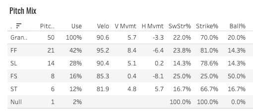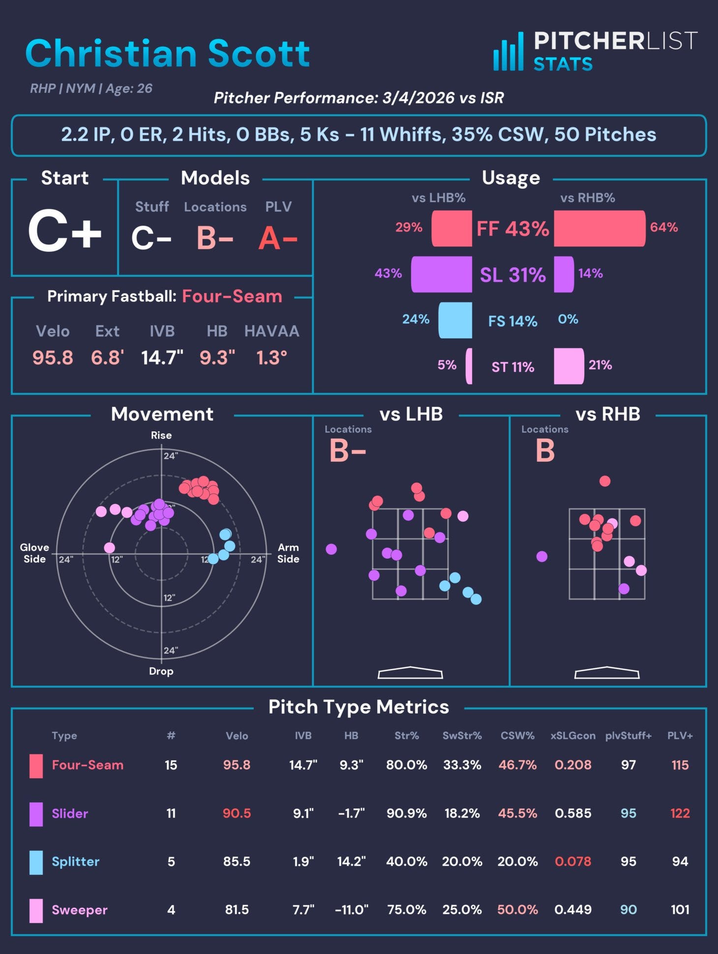 Scott’s fastball kinda sucked, then, right? It’s his first start back, so yeah - grain of salt or whatever, but we do really prefer high stuff marks on four-seamers. Stuff+ on other pitches, I don’t really care about. It’s also a constantly moving target. Hitters are getting better against pitches they used to be really bad at, and that causes Stuff models to mislead. But it’s still useful stuff, especially in these specific situations where you have a guy with very little recent data, and you’re trying to make some educated guesses.