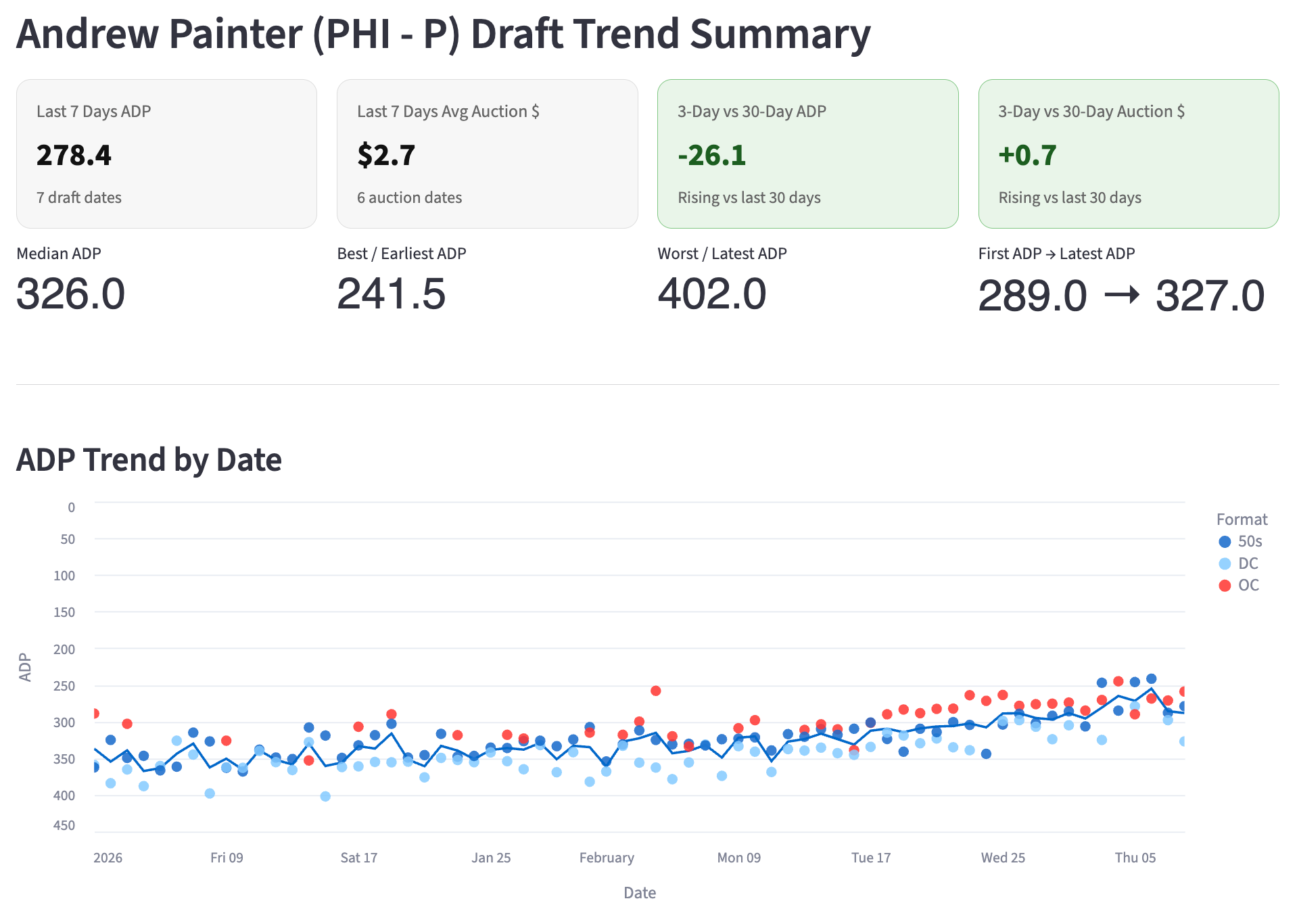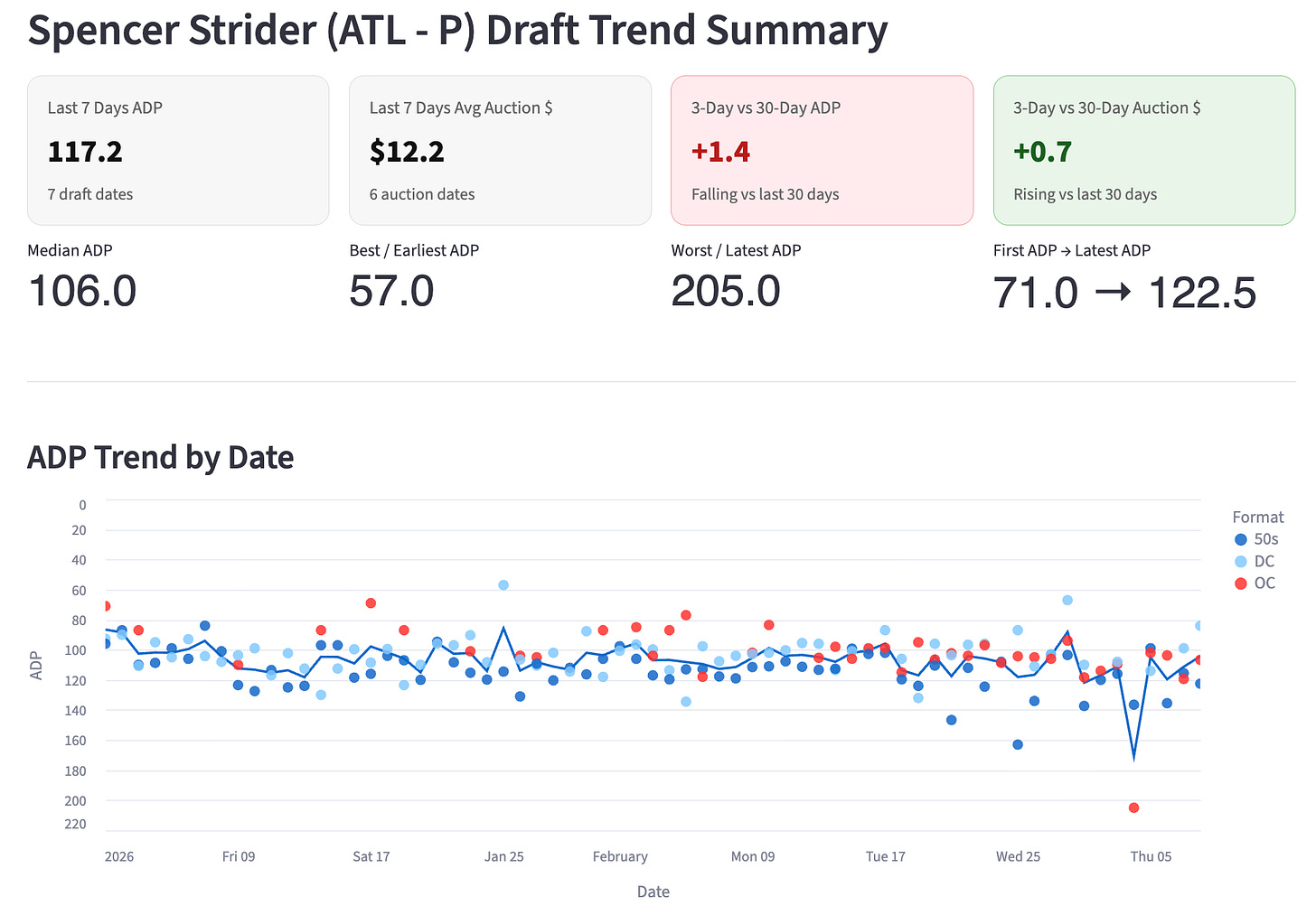 He’s a unicorn of sorts. Two-pitch guy who had two of the best pitches in the league for starting pitchers before his injury. His four-seamer was high-90s and devastating, and he had a sick hard slider with it as well. But he’s lost velocity over time, especially after the internal brace thing in his elbow. I came into 2026 needing ot see 96-98 from his fastball before I’d consider drafting him.
