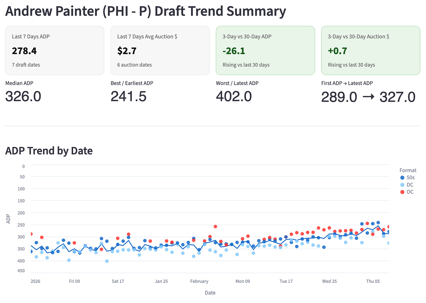 Another high upside NL East pitcher we’re keeping an eye on this spring is Andrew Painter. He’s one of the game’s top pitching prospects, but it’s been a long time coming. He’ll turn 23 in April, so he’s still young, but his big breakout season was back in 2022 when he threw 108 innings as a 19 year old with a 39% K% and a 6.5% BB%. He was smoking dudes. And then he had Tommy John and missed the entire 2023 and 2024 seasons (at least as far as pitching in a regular season game goes).