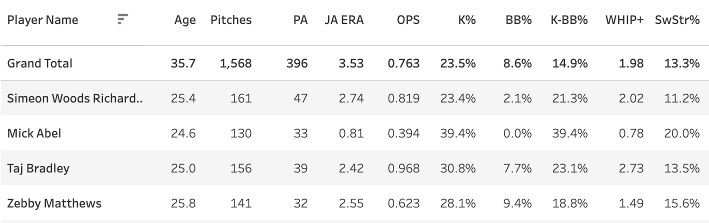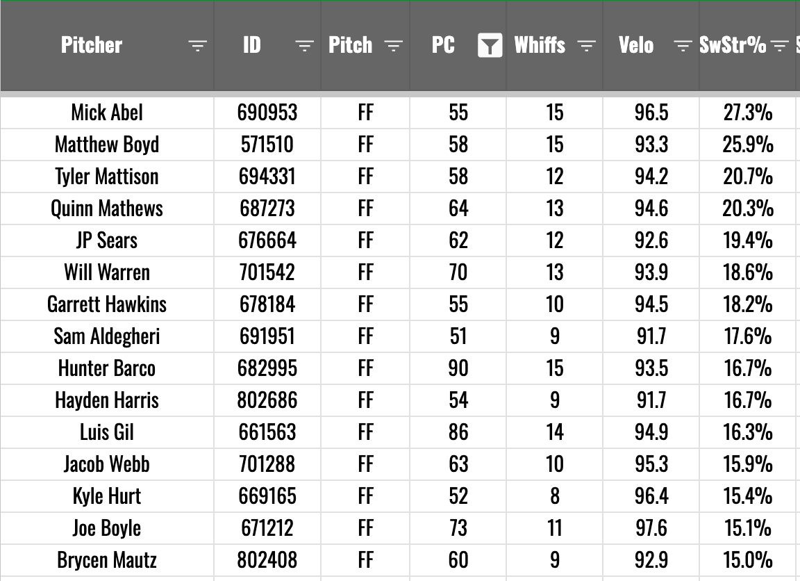 Speaking of fastball data, Abel leads the spring with a 27.3% SwStr% on the fastball (50 pitch minimum).