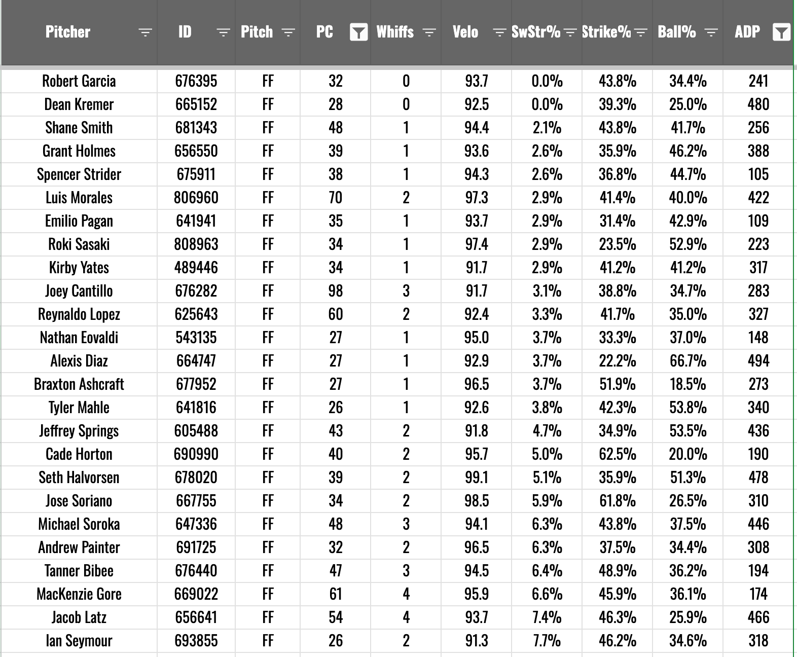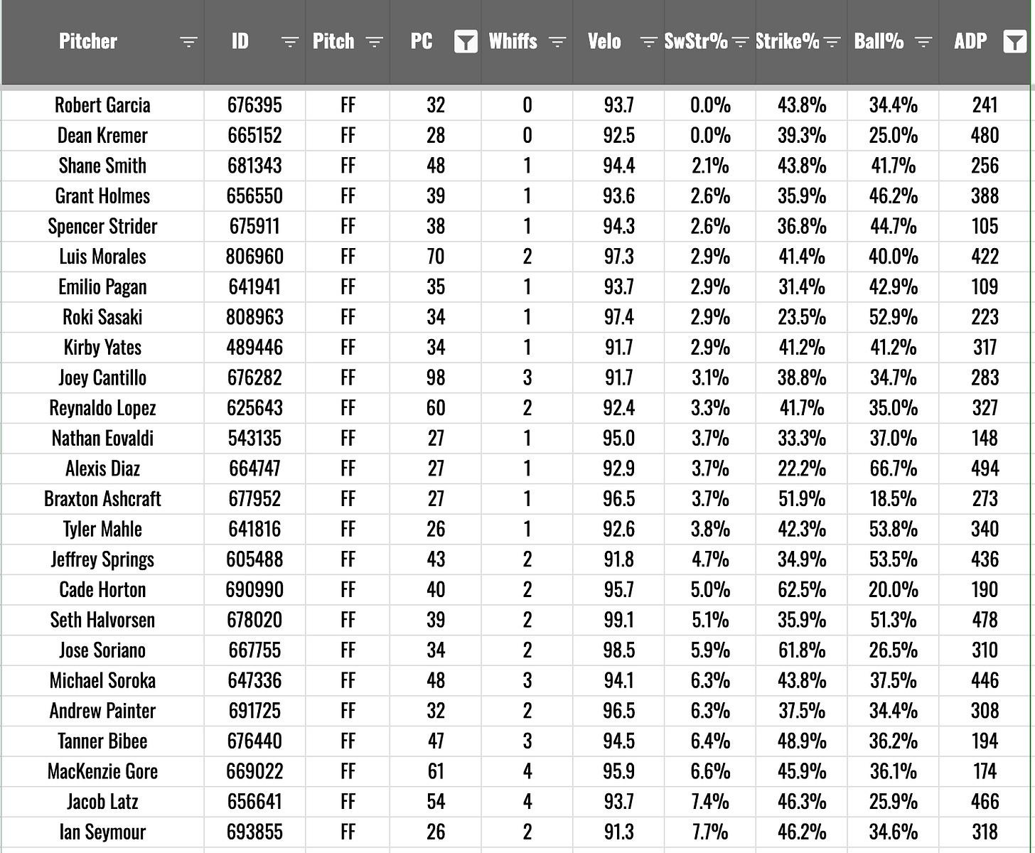 It’s only a 32-pitch sample. But there are only two whiffs on the pitch. Maybe it means nothing, but to me it’s a bad sign. Here are your worst-performing four-seamers in SwStr% this spring among SPs who are being drafted in fantasy leagues this year: