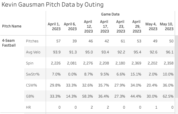Kevin Gausman's FF velo (50 pitches) UP 2.6mph to 96.1