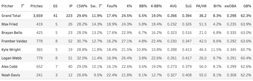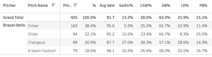 Only 7 SPs have generated GB% above 60%, and Bello ranks behind only Fried in SwStr% of that bunch. Plenty of ceiling for Bello.