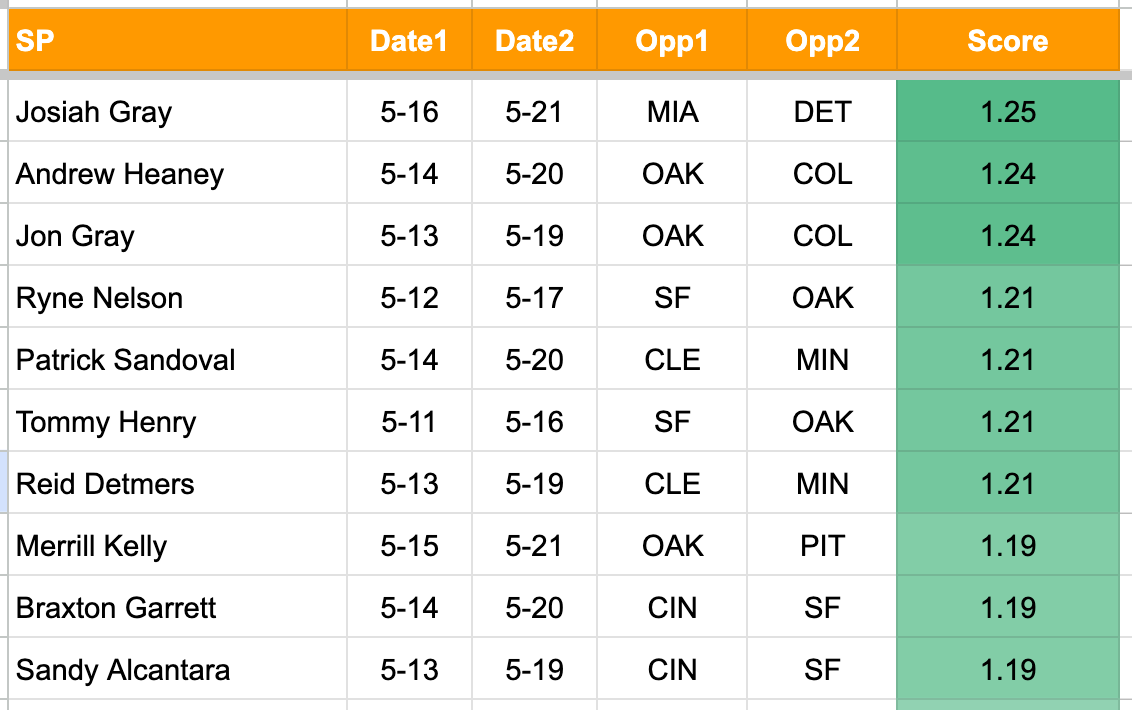 Basically, the script goes through every pitcher and grades their next two matchups, and then ranks them in a Google Sheet. It runs automatically every morning so it’ll be up to date by the time you get these notes, here’s a preview:
