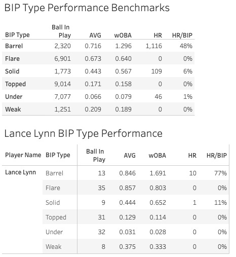 Here’s where you can see those numbers compared to the league averages. Hitters have an .803 wOBA on his most-commonly allowed batted ball type (the flare, which softer line drives), and the league average on that same type is just .640. That’s certainly not a skill thing, and it’s just random bad luck for him that so many of those are falling in.