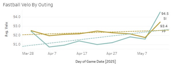 Spencer Schwellenbach's FC velo (17 pitches) UP 1.7mph to 94.9