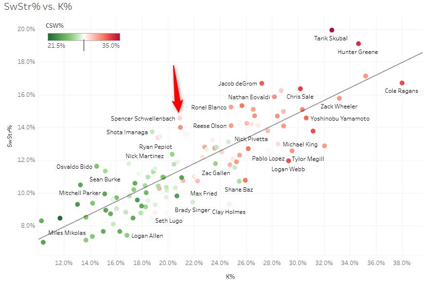 I’m not sure if you can buy low on Schwellenbach, but I do think he’s going to have a very, very good rest of the year. He’s one of those mismatchers on the SwStr% vs. K% analysis.
