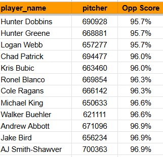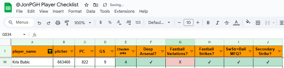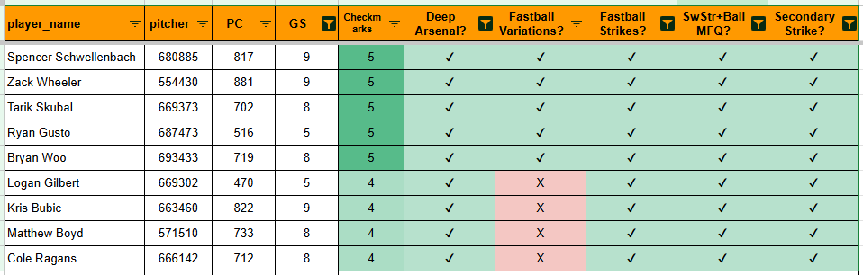 He has FOUR, and that’s perfectly fine. The fastball variations one is a little bit nitpicky. You don’t need that to be good. That’s probably the least important checkmark. It’s more of just like a “that’s nice to have” thing. If you’re getting a ton of strikeouts, I don’t really care what pitches you’re doing it with. So if we look for SPs with those four checkmarks.
