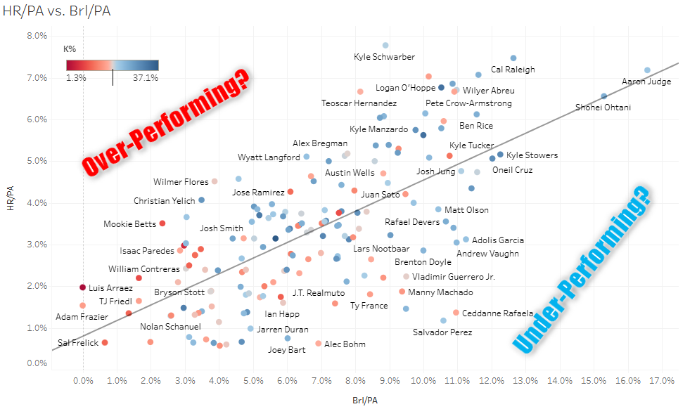 Here’s the updated HR/PA vs. Brl/PA plot. This is a non-awful way of seeing which hitters are over performing or under performing in power production.
