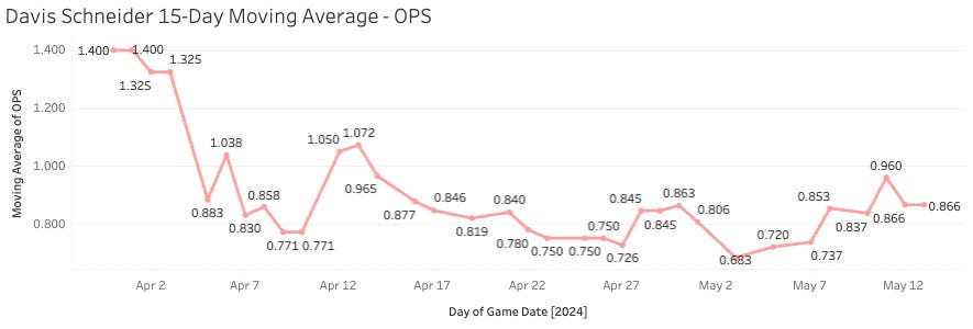 If you need some infield power, Davis Schneider is available in plenty of leagues. He now has the K% down to a manageable 27% and the barrel rate is nice at 11.6%. The OPS is up to .840, he walks a good bit (12%), and the xwOBA is nice a .361. He was almost a half-time player at the beginning of the year, but he has started every game but one in May.