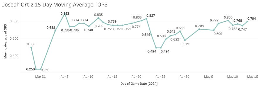 Joey Ortiz has also been better of late. He’s slashing .268/.354/.634 with three homers and a 10.4% Brl% on a 21% K% over his last 48 PAs since April 26th. Typically we wouldn’t care about a 50-PA sample, and we still really shouldn’t, but it always is more interesting when it’s a rookie. It’s much easier to believe that someone fresh into the league would struggle a bit at first and then slowly improve as they get used to Major League pitching.