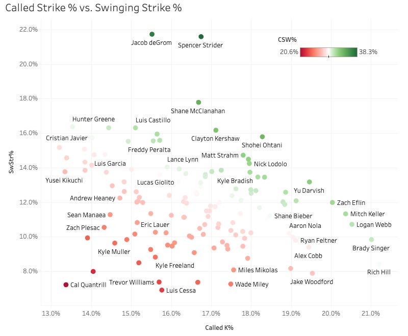 He’s the only pitcher in the league with a K% above 30% and a SwStr% below 12%: