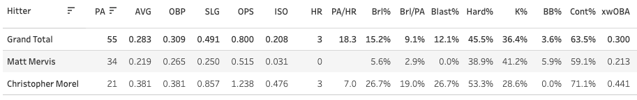 Morel with the 29% K%. That’s no surprise, but it is good to see it under 30%. You can manage that if you have a ton of raw power, which Morel would seem to have. The 71% Contact% is also pretty solid.