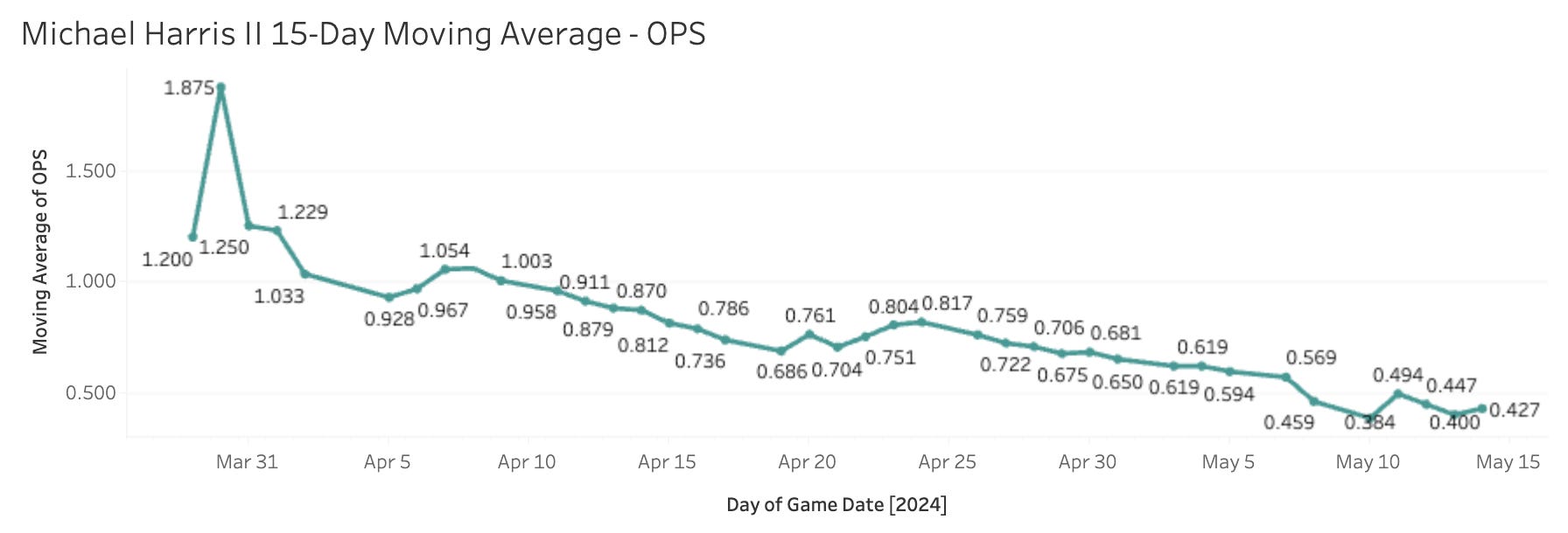 As for Michael Harris, you could smoothly ride a skateboard down his rolling OPS graph, which would be fun, except I get so scared when I stand on a skateboard. All of my high school friends were skaters, so I tried to get into it one day and on like my second try of riding it I fell and jacked up my leg and then I just quit. I was a quitter as a kid. I quit little league as like an 11 year old because I was too scared to come up to the next age group because the pitchers threw way harder.