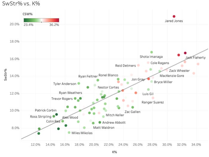 I like to compare these two because SwStr% is highly correlated with K%, but that doesn’t mean that every single outlier will definitely regress upward or downward based on that. Some guys can get whiffs but the command just keeps them away from earning those few extra strikeouts that a lot of other guys do, some guys for whatever reason can’t get as many called strikes as other guys, etc. But in general, the higher SwStr% players do seem to pop off for high strikeout outputs every once in awhile, which we have seen with everybody on that list above this year.
