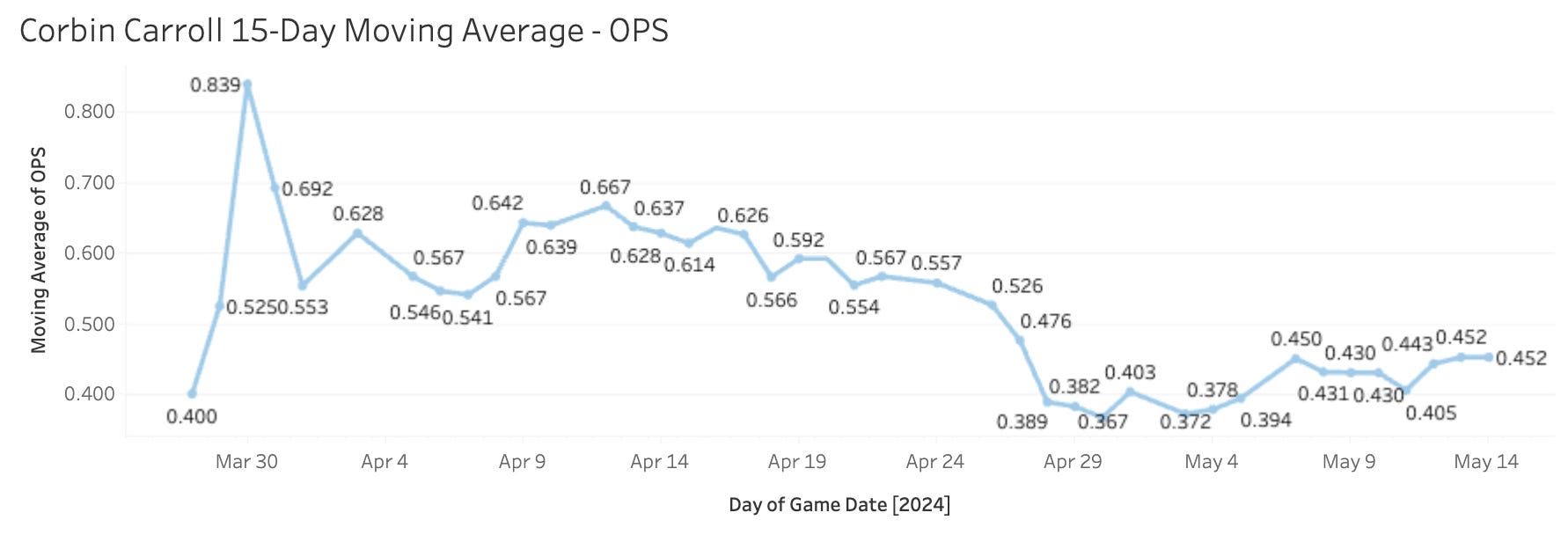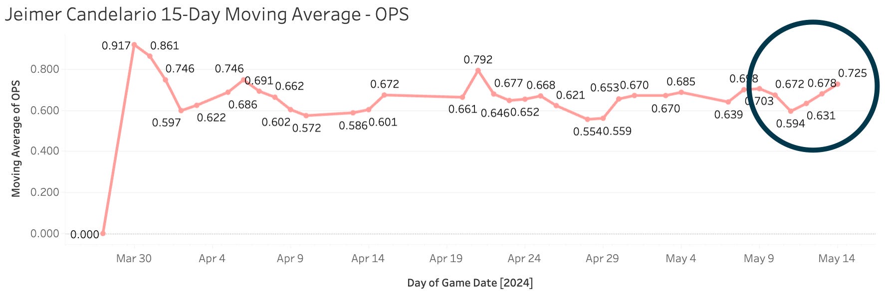 So more whiffs, more balls on the ground, but the EV stuff is still pretty fine. His xBA is .273 and the xSLG is .409, so he should certainly improve in AVG but he’s going to put up some more disappointing power numbers until he starts lifting the ball more often.