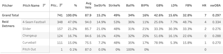 The season K-BB% is now at 15.8%, which is still pretty decent. The SwStr% isn’t horrible either at 12.6%, and he continued to just get drilled by BABIP at .387. That said, he has given up a lot of hard contact (.331 xwOBA) and line drives. The GB% is 41%, so it makes some sense that he would post a high BABIP. The bigger problem might be the limited pitch mix. He throws 42% four-seamers (15.6% SwStr%, 55% Strike%, 27% Ball%) and 30% changeups (12.2% SwStr%, 40% Strike%, 38% Ball%). That leaves him with just 29% for the slider and curveball. Basically he doesn’t have a truly standout pitch. The four-seamer numbers are really strong there, but I’m not sure that can really stick around given the vleocity (93.8) and the history of it. The disappointing thing has been the changeup, which needs to get better.