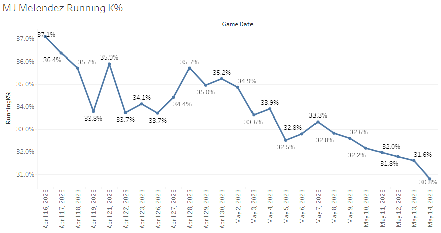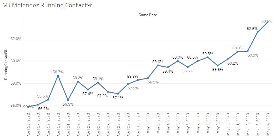 MJ Melendez is coming around in recent weeks, dropping the K% and raising the Contact%: