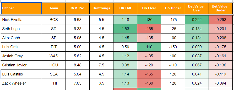 My projections have been high on Pivetta all year… but that’s not the point. Right now my projection is 6.68 and the line is 5.5. That means my model thinks it’s pretty likely for the result to be over 5.5. The vegas over line of +130 says it’s unlikely to go over 5.5, so there is a big disparity there. The .222 you see there says that the difference my model’s projection of how likely the over is to hit is 22.2 points above what the Vegas line implies. So my model might be saying it’s a 68% chance to hit, and the Vegas line is saying it’s at 46%. That’s how you interpret that.