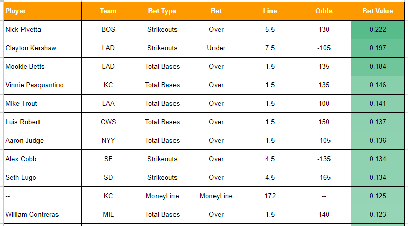 Yesterday, the K props were quite good going 4-1 at the top of the sheet, but the total base recommendations weren’t so good and overall it was a losing night for me. But it will be fun to track and see which bet types seem to do better and worse. For me, this really isn’t about making money - it’s more of just trying to solve a puzzle.