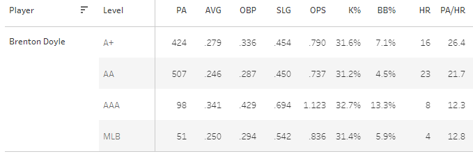Shifting to hitters, Brenton Doyle had a double-barrel game. He has four homers and a 19% Brl% in 51 PAs, but the K% is up at 31% and he doesn’t walk much (6%) and the contact rate is low at 71%. He’s posted strikeout rates above 30% at every level of the last three seasons:
