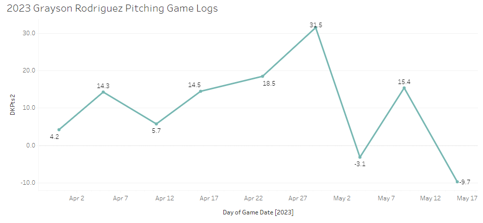 Grayson Rodriguez had another bad start and now sits with a 25.9% K%, a 10.0% BB%, a 12% SwStr%, and a .359 xwOBA. I am surprised at how low the K% and SwStr% since he was supposed to have wipeout stuff. It’s not surprising when a rookie pitcher walks a lot of guys and gives up some homers, but we were promised elite stuff from Grayson, and it doesn’t seem to be the case!
