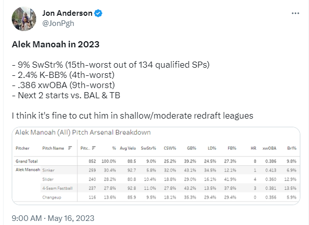 Alek Manoah has been awful and there’s not much for redeeming qualities in the profile. Here’s me showing off my own tweet!