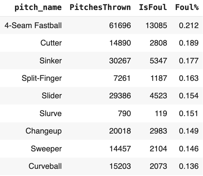 So four-seamers get fouled off the most. I wonder if velo matters!