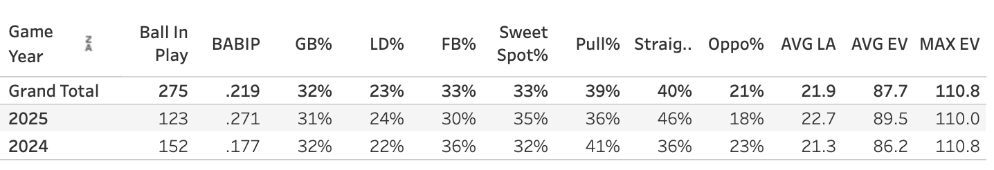 The numbers still aren’t impressive this year, but he’s at least cleared the .700 OPS mark down with an xwOBA above .300. He’s hitting the ball harder, finding the sweet spot more often, and he shook off that .177 BABIP from last year.